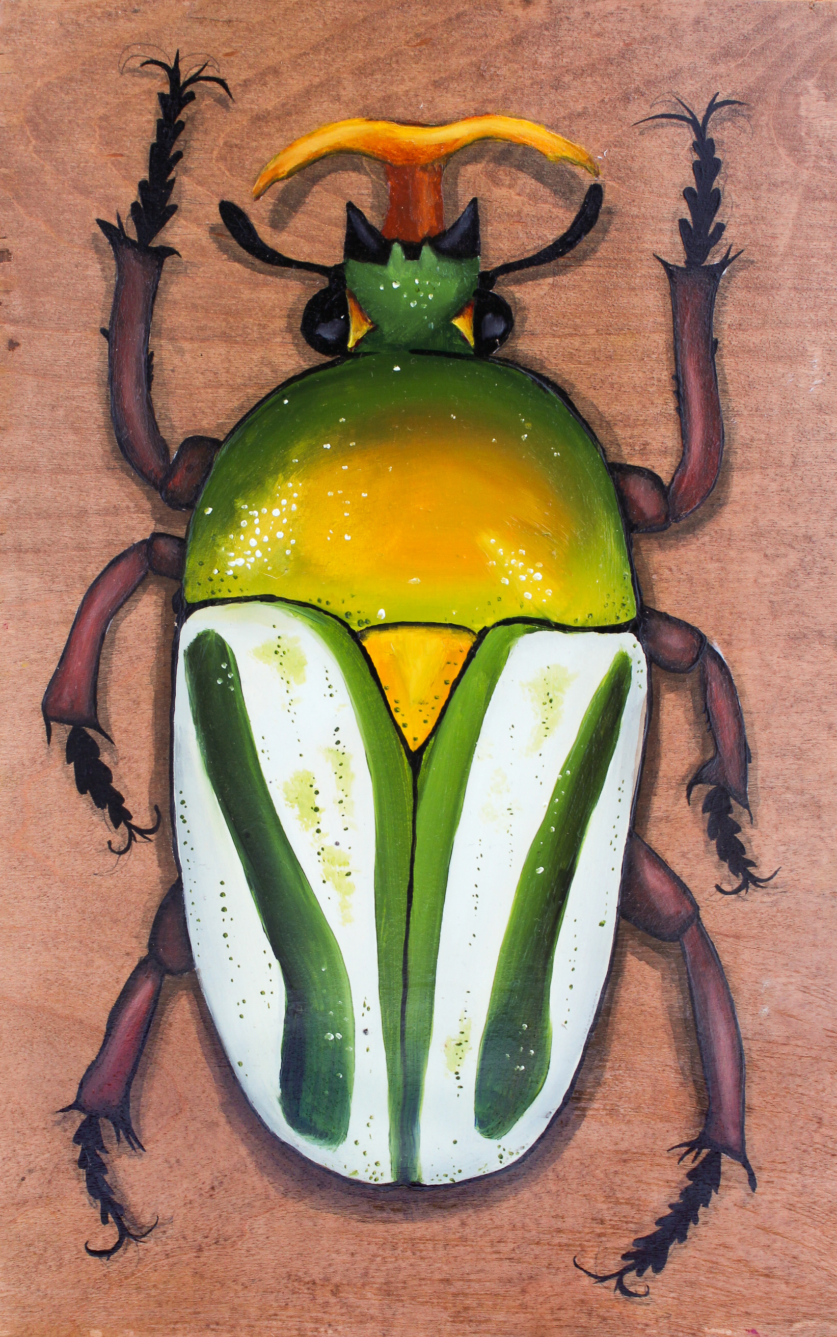 "An Inordinate Fondness" is a series of oil paintings on wood depicting several very real beetles on a large scale, twelve in total. They range from ten to forty-eight inches in height and are rendered in vibrant color and coated in a lacquer to enhance their captivating shine.